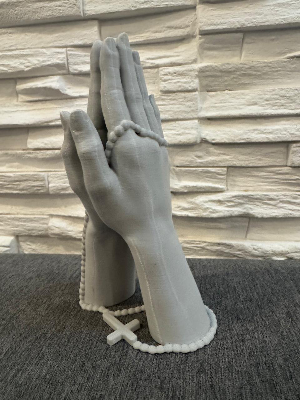 Creada mediante impresión 3D de alta precisión, representa unas manos unidas en actitud de oración, con un rosario que cae suavemente entre los dedos.